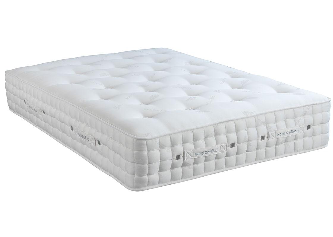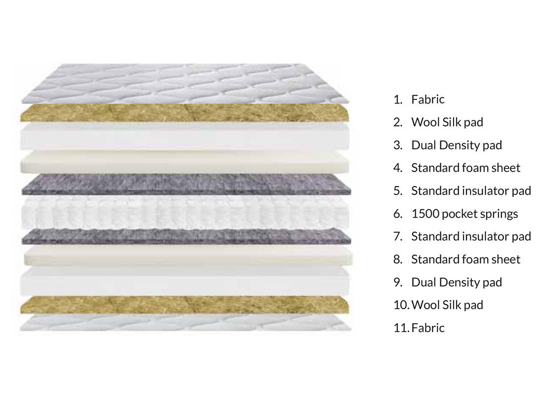 Naturally cool wool silk fillings in this double sided, 1500 Pocket Sprung hand tufted mattress. FR Chemical free damask fabric and stitched by hand.